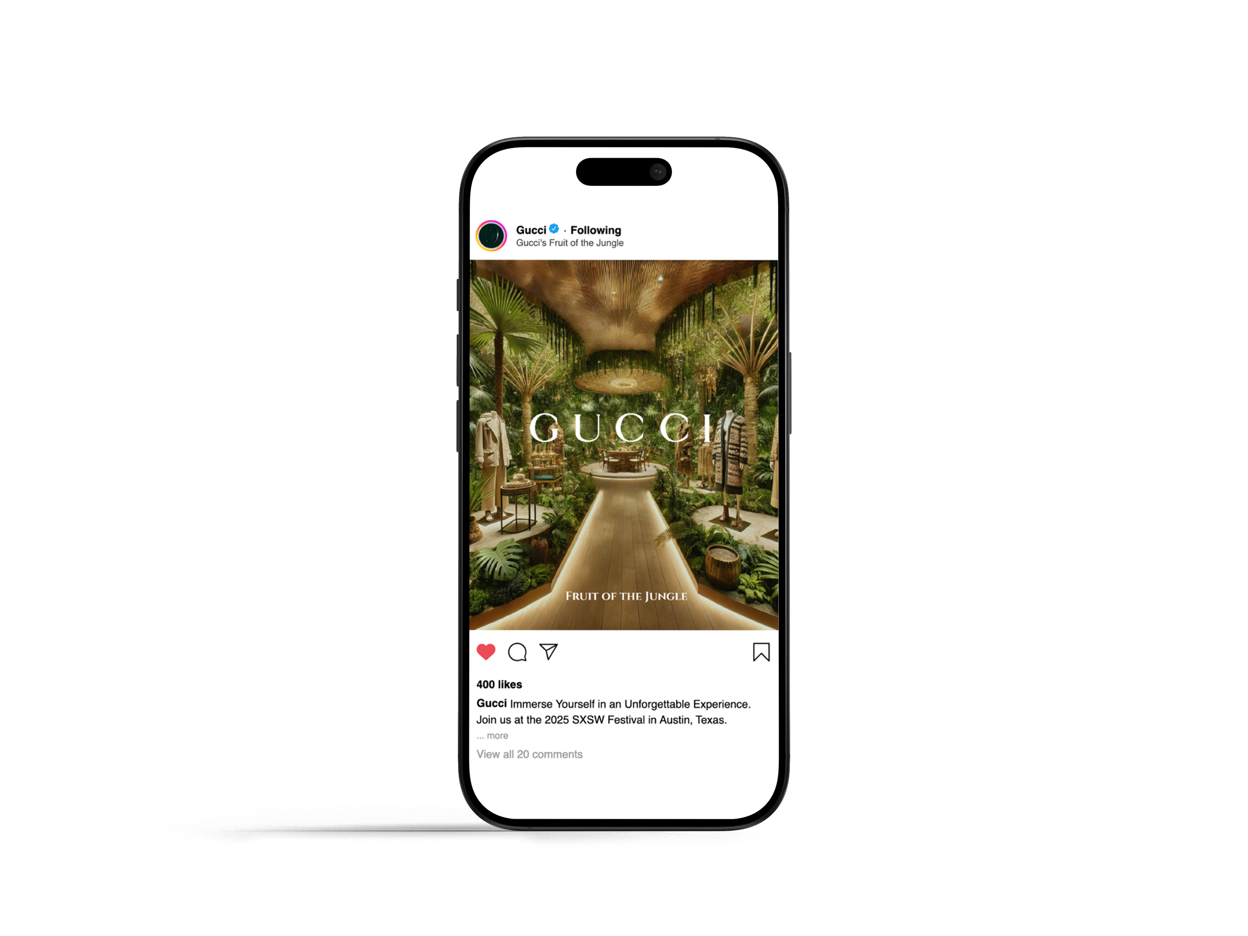 Create an immersive jungle pop-up experience at SXSW featuring The Forbidden Tree (red Gucci bags as "fruit"), unique scents, soundscapes, and nature-inspired fashion displays, plus guerrilla marketing with models walking urban streets in jungle couture to drive foot traffic.