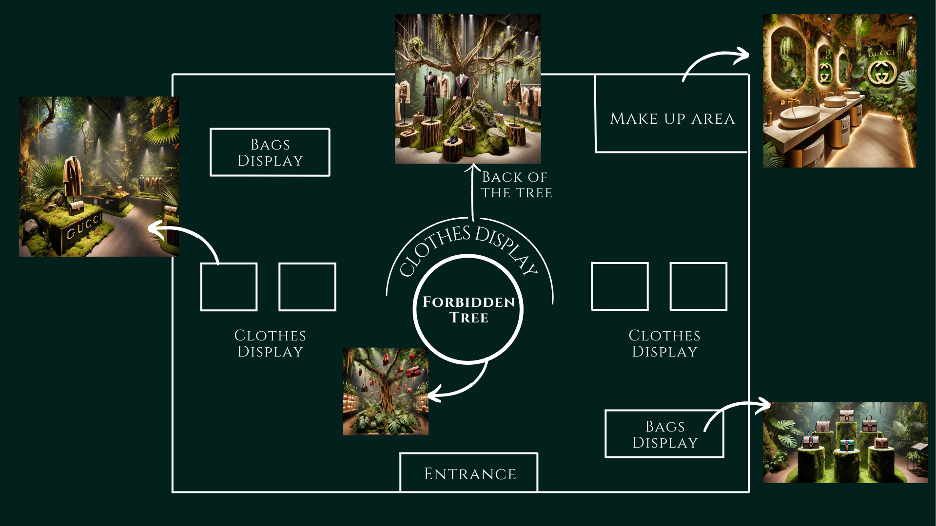 I co-developed an immersive brand experience for Gucci's "Fruit of the Jungle," a jungle-inspired pop-up at SXSW in Austin. The concept featured a central "Forbidden Tree" installation with red Gucci bags as symbolic fruit, representing desire and exclusivity. Together, we designed the full customer journey, from nature-integrated displays and fragrance-driven sensory elements to interactive beauty zones and guerrilla street activations. This project strengthened my expertise in experiential marketing, spatial storytelling, and translating brand identity into immersive physical environments.
