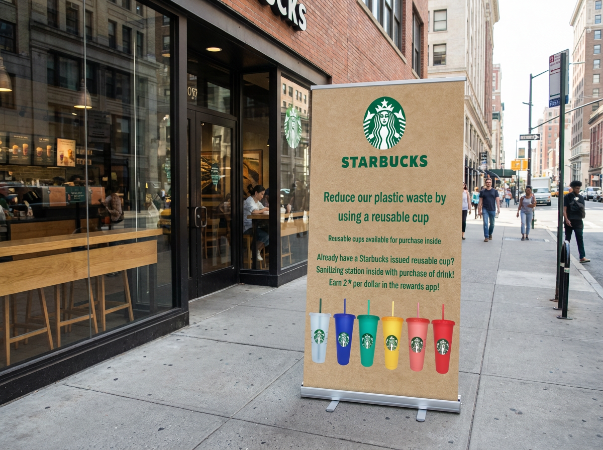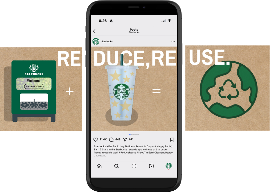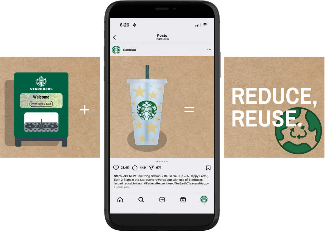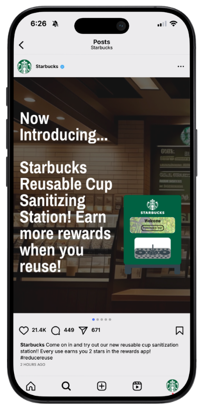 I developed an integrated sustainability campaign for Starbucks to reduce single-use plastic waste through a Reusable Cup Sanitizing Station, a physical in-store installation paired with a digital rewards system in the app. The campaign incentivized customers to make sustainable choices by earning bonus rewards for using reusable cups. I designed a multi-channel ecosystem including Instagram posts, carousel ads, in-store signage, outdoor banners, and billboard mockups. This project strengthened my ability to merge innovation, sustainability, and experience design into a cohesive campaign.