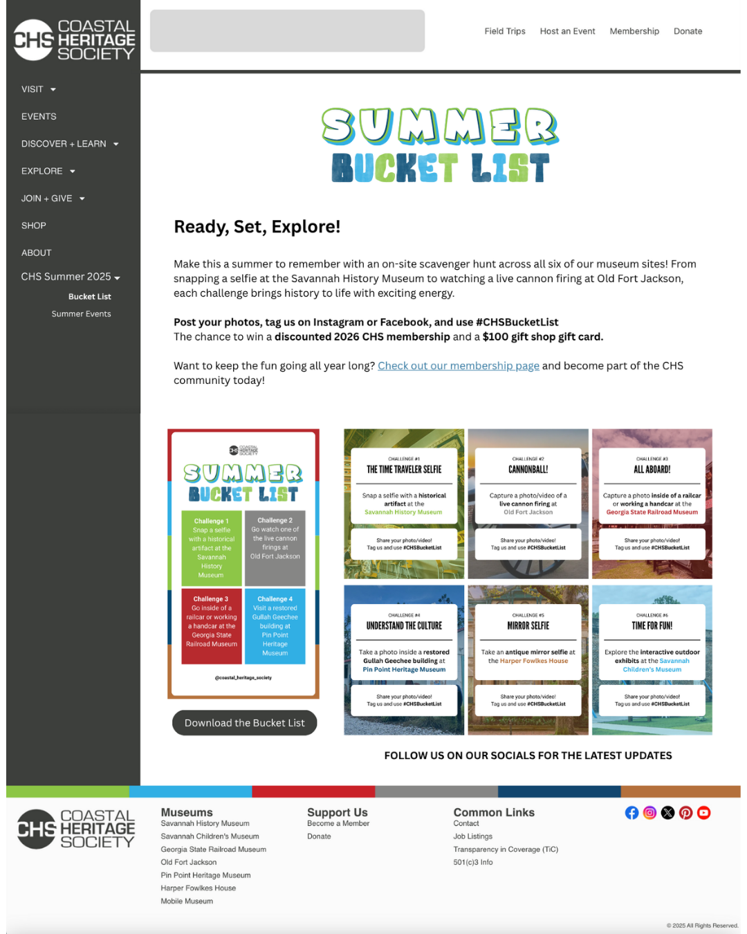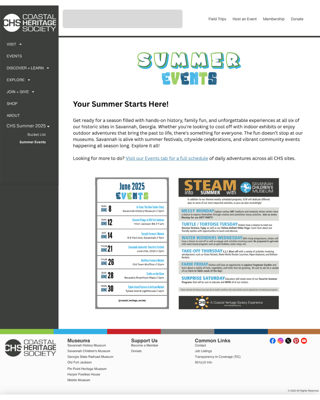 In this collaborative project, I worked alongside a team of three other creatives to develop a full-scale social media and membership growth strategy for Coastal Heritage Society, a nonprofit organization that operates six museums across Savannah, Georgia. Our team conducted a comprehensive audit of CHS’s brand, audience behavior, competitors, and digital presence to identify key challenges, including low membership awareness and limited storytelling across social platforms.