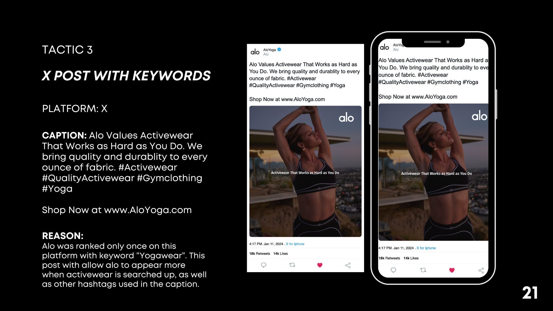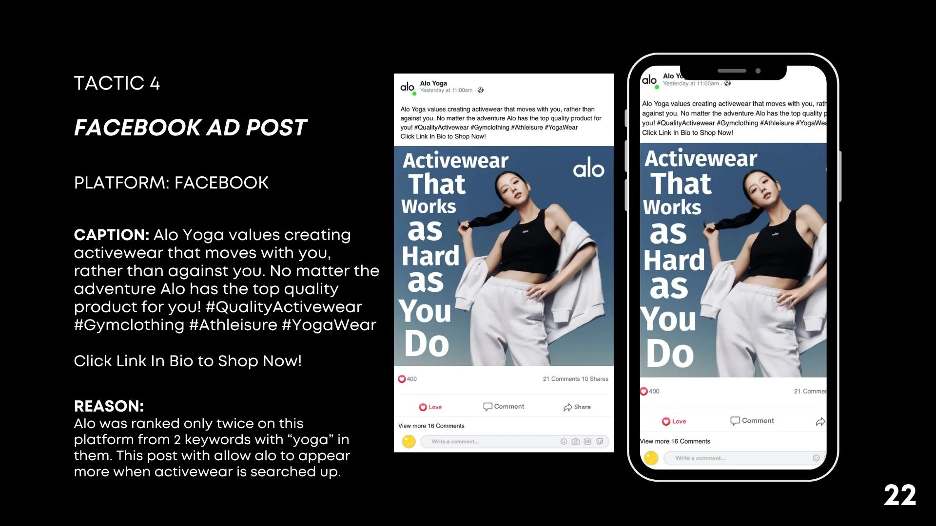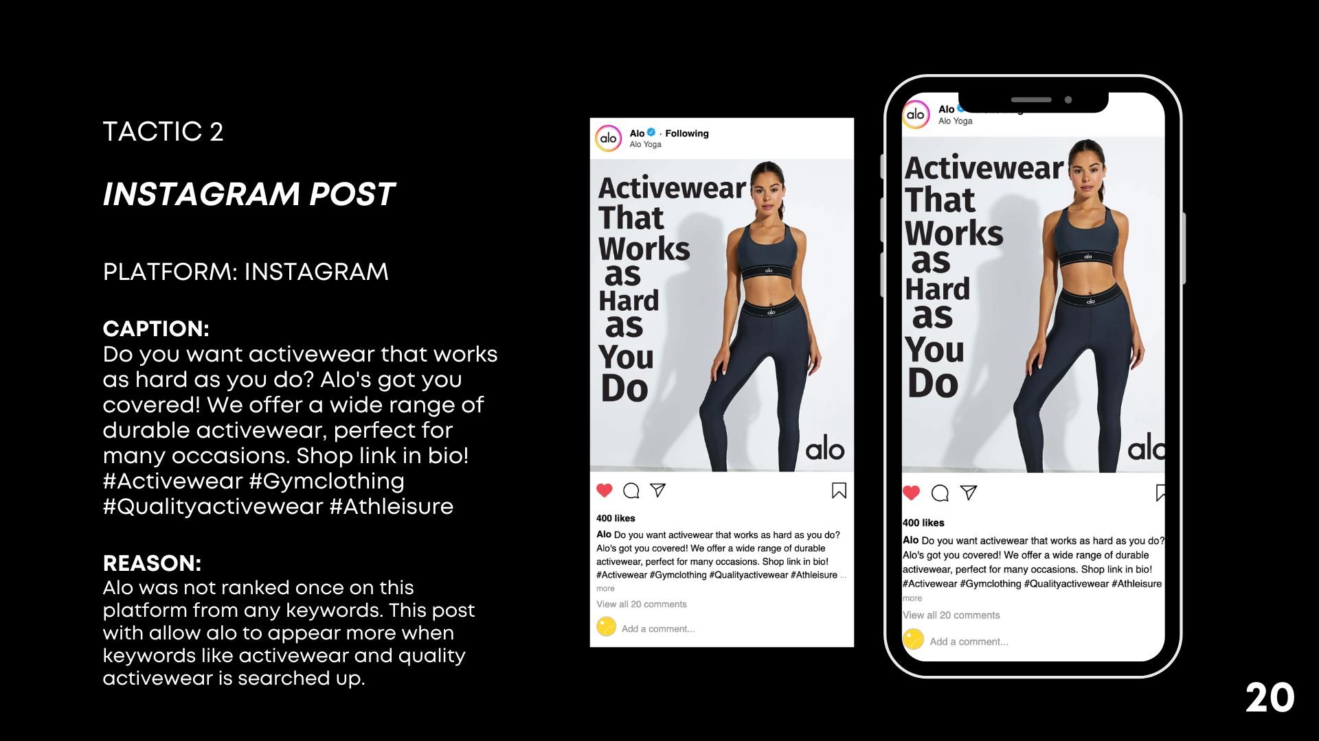 From this research, we developed a campaign concept titled “Activewear That Works As Hard As You Do,” designed to reposition Alo as a performance-driven, premium activewear brand. We created platform specific strategies, keyword-driven content, and UGC focused tactics to increase visibility, strengthen engagement, and improve SEO rankings. This project strengthened my ability to blend data, creative strategy, and real world competitive insights into cohesive, actionable digital campaigns.